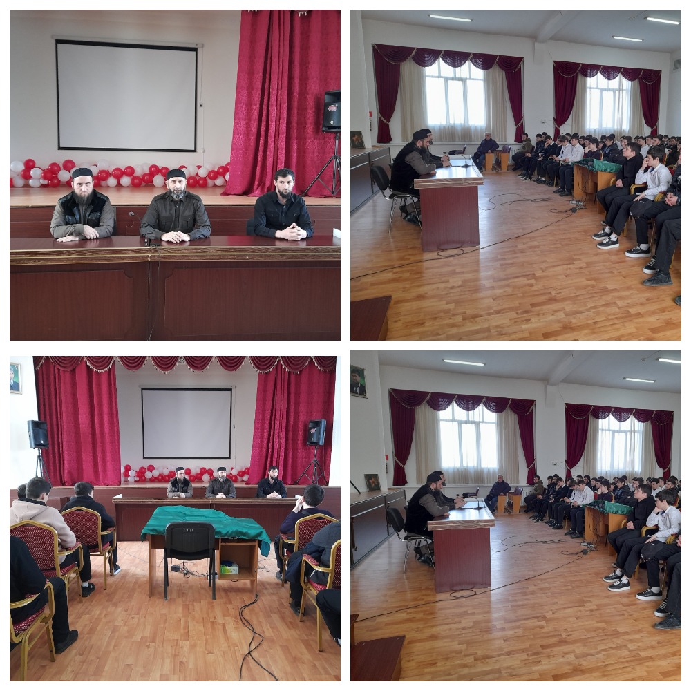 24.01.2023В рамках реализации Единой Концепции духовно-нравственного воспитания подрастающего поколения, в ГБПОУ «Чеченский профессионально-технологический колледж» состоялась встреча обучающихся с сотрудником департамента по взаимодействию с религиозными и общественными организациями Администрации Главы и Правительства ЧР Абдурахмановым Мохъмадом, а также с сотрудником Центра по противодействию идеологии экстремизма и терроризма по ЧР.В своей беседе выступающие затронули разные темы духовно-нравственного воспитания подрастающего поколения – говорили о святости месяцев Раджаб, Шаабан и Рамадан, о почитании обычаев и традиций чеченского народа, о семейных ценностях, уважении и почитании старших, своих родителей. Также был затронут вопрос профилактики экстремистских проявлений, профилактика наркомании. Особый акцент был сделан на пользовании телефонами, какая угроза может исходить от разнообразных сайтов, подписок. Необходимо быть очень осторожными при общении с незнакомыми людьми. Обучающиеся в количестве 120 человек внимательно слушали выступающих. Во встрече принял участие ст.воспитатель по ДНВ колледжа Абдулхаджиев М.